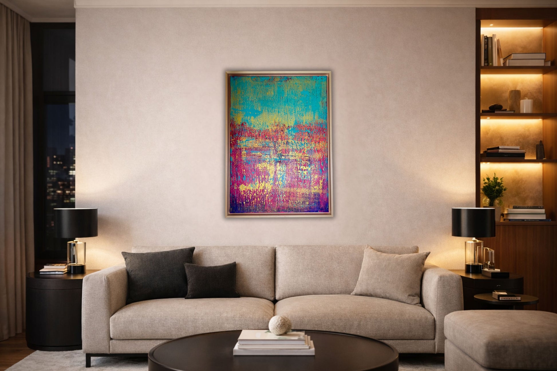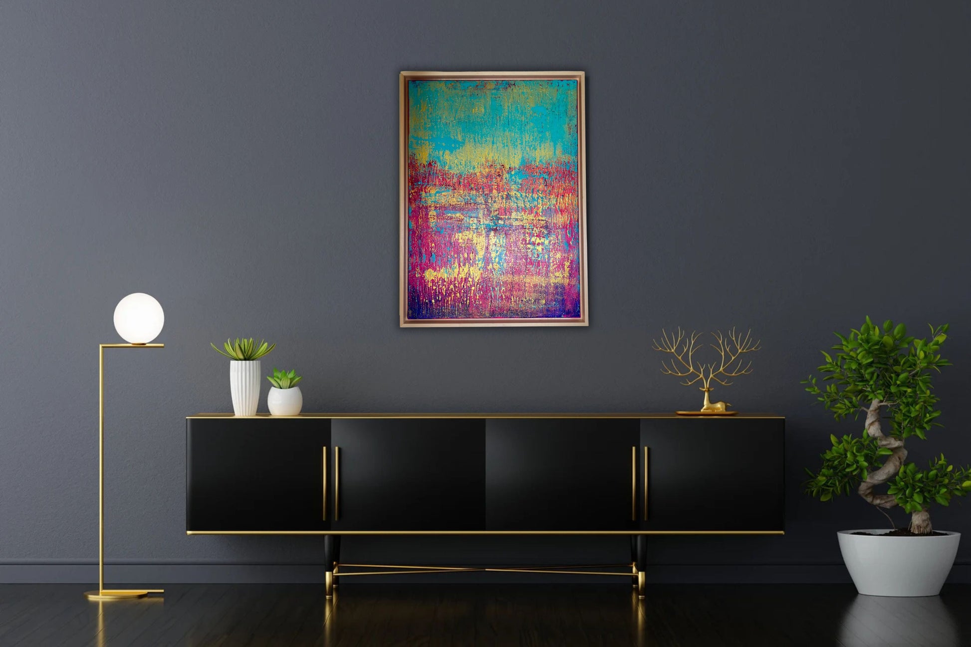 Dieses auffällige, abstrakte Kunstwerk auf Leinwand verleiht jedem Raum eine dynamische und inspirierende Atmosphäre. Das moderne Gemälde mit seinen leuchtenden Tönen präsentiert eine farbenfrohe Mischung aus Türkis, Pink, Gold und Blau.